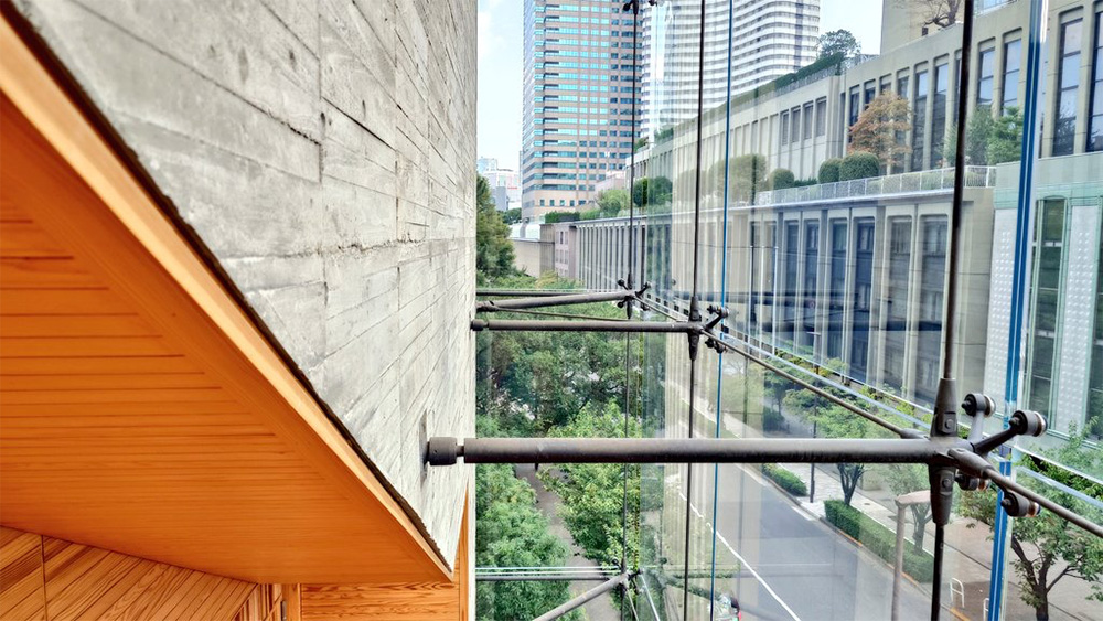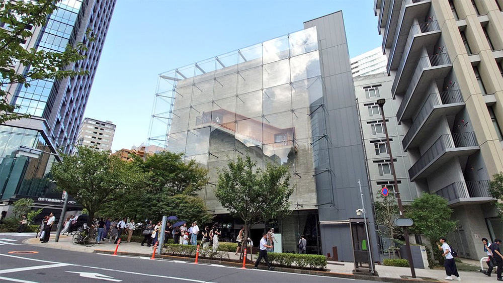 赤坂見附駅から徒歩7分、人だかりができていてすぐに目的地がわかりました。コンクリートの打ちっぱなしにガラスのベール、中から木とお客さんが見える…情報量の多い建物です。