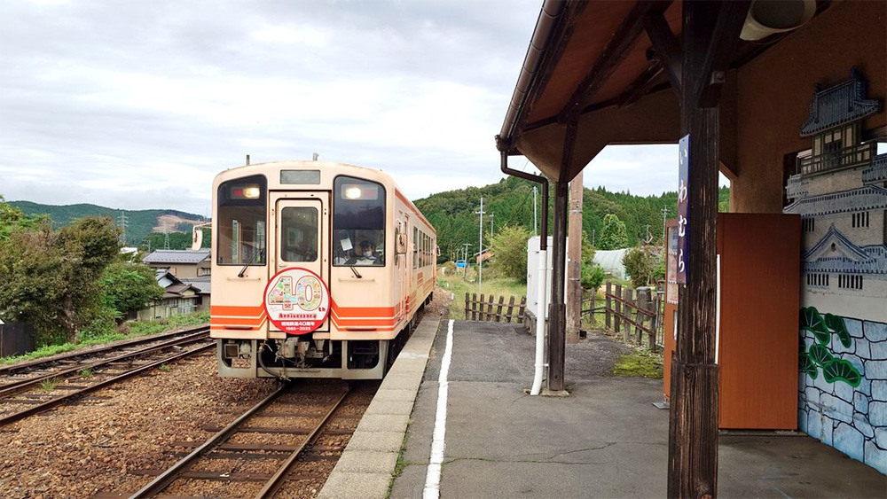 2025年10月19日、明智鉄道の岩村駅にやってきました。1両だけの編成ですが、ハイキングに行く人々で車内は賑わっています。