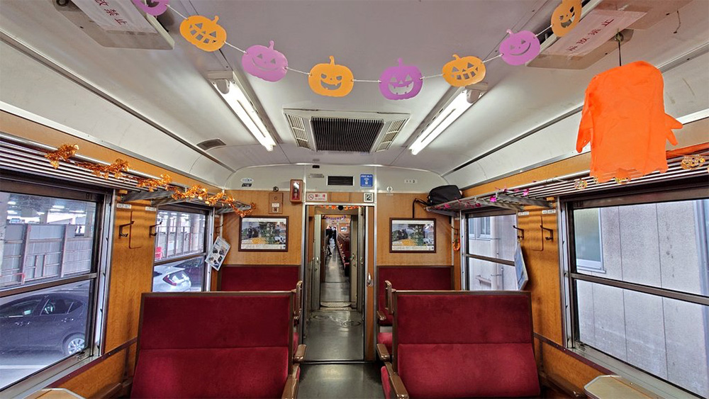 SL HALLOWEEN EXPRESS は、ヘッドマークが特別仕様で、車内もハロウィン装飾されています。