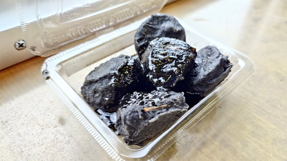 車内で販売している「SLパレオの石炭みそポテト」(300円)。真っ黒で本当に石炭みたい!けど、しっかり味は秩父名物のみそポテト。美味しいです。