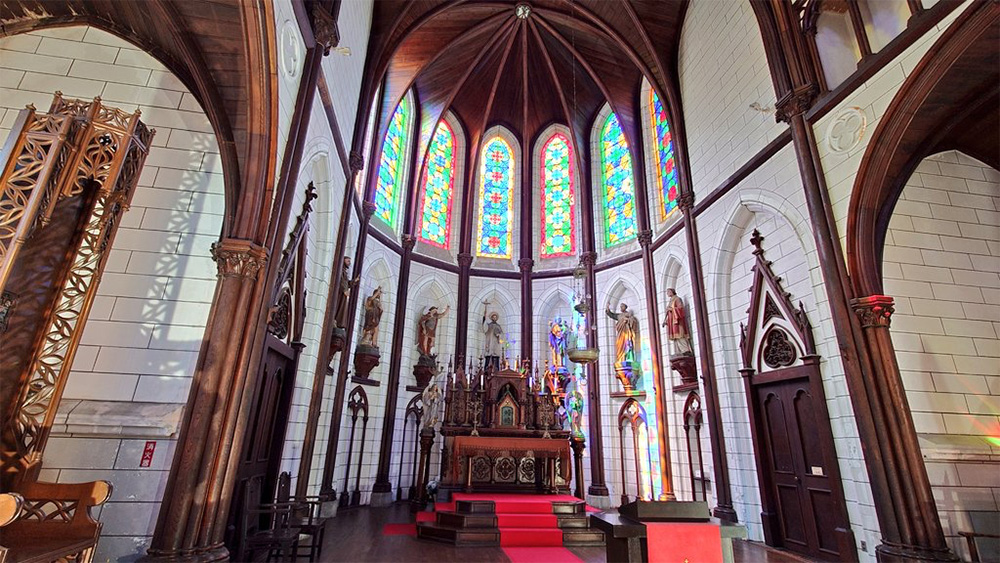 美しい内部、ステンドグラスの鮮やかな色が降り注いでいます。