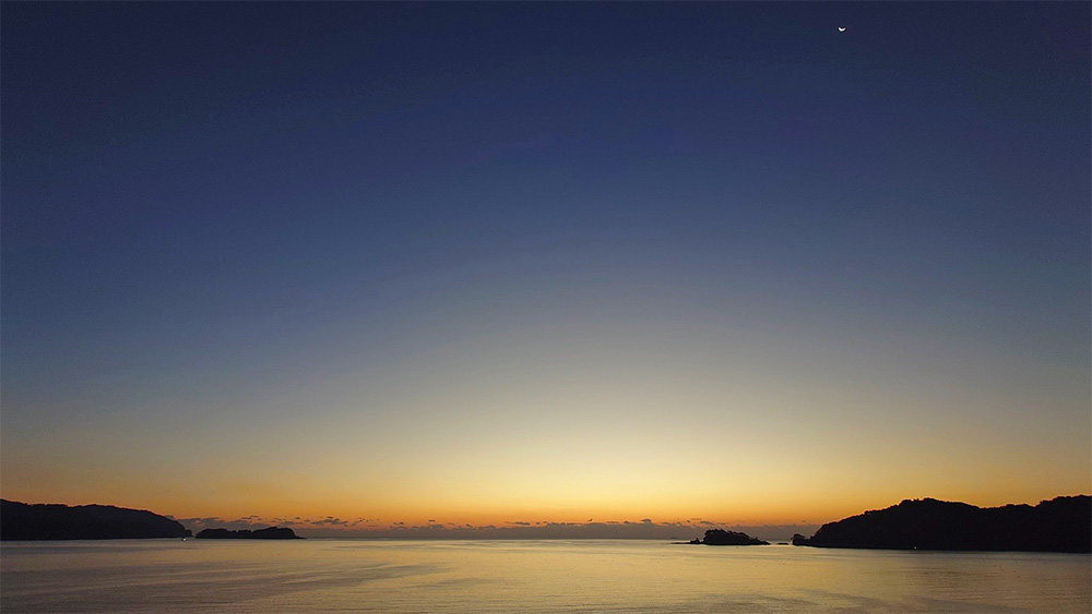 6:00am大槌町にて暁穹を撮影。まだ暗い部分には賢治さんが恋する土星も、他の星も無くて月だけがいます。けれども美しい!あまりに綺麗で離れ難かったので、日の出も見ることにします。