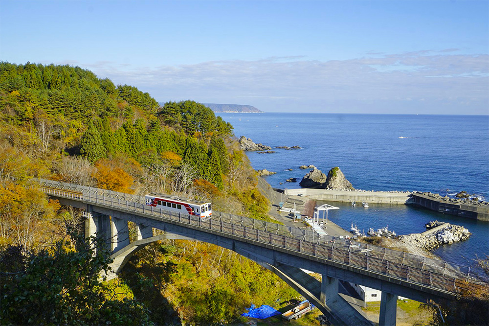 大沢橋梁で停車中の三陸鉄道車両。車窓から見た赤い橋から撮影!
