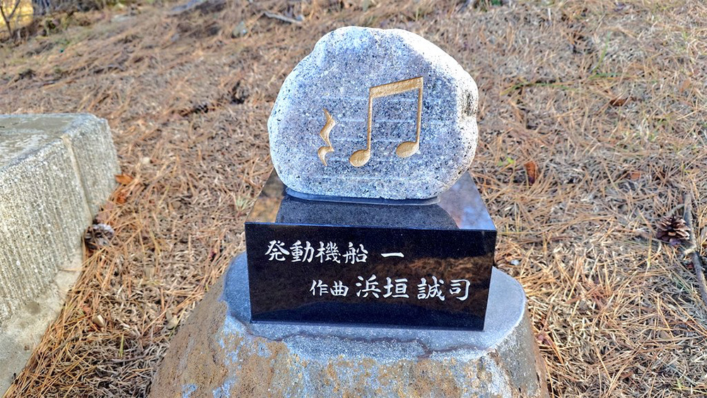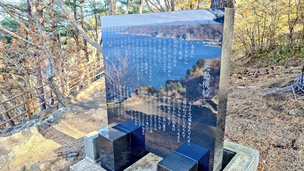 「発動機船 一」 の詩碑はピカピカに磨かれていて、機船が走ってきた海の景色を映しています。