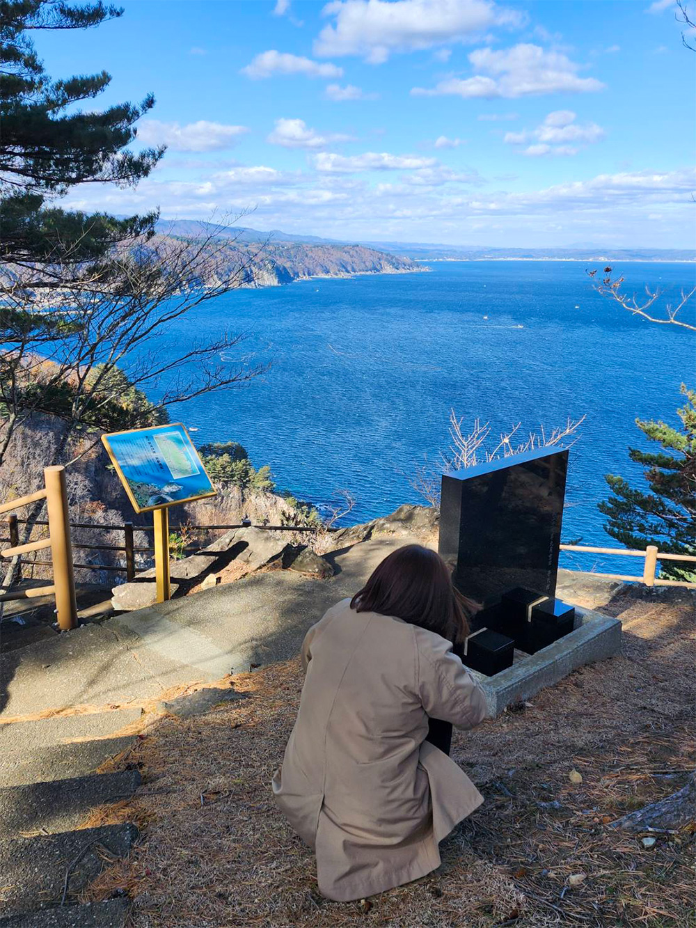 石碑をまじまじと見つめた後、石碑と一緒に賢治さんが船に乗ってリアス海岸の岬を回り込んできた景色を見つめます。