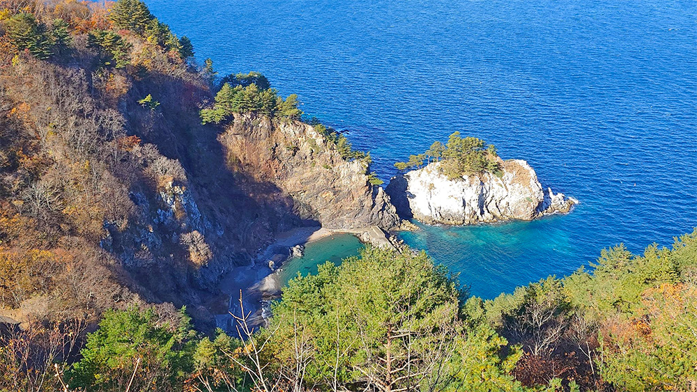 看板まで降りて覗き込むと、「ネダリ浜」の白い岩礁が見えました。確かに、あそこだけが白いです。綺麗!
