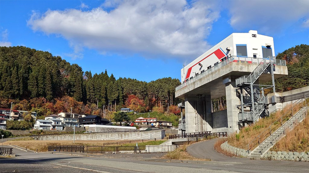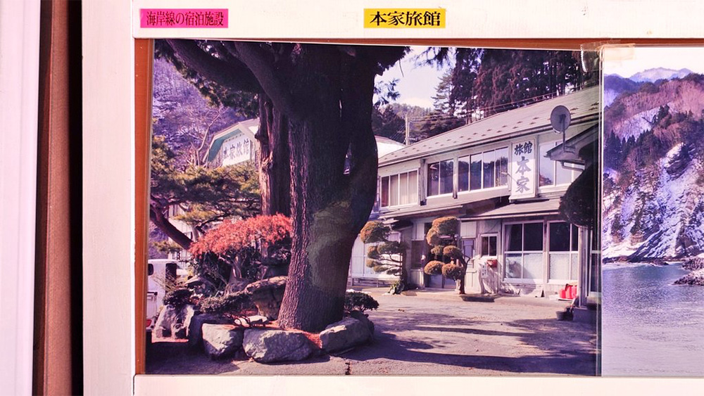 三陸鉄道の車両の形をしているのが「ひらいが水門」です。奥に進むと平井賀漁港。水門の左側にある黒い建物が閉業した「本家旅館」です。