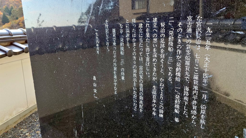 詩碑の裏面に賢治さんが羅賀の平井賀港から南下した説が書かれています。田野畑村の賢治詩碑は3基とも賢治生誕100年の年(1996年)に建立されました。