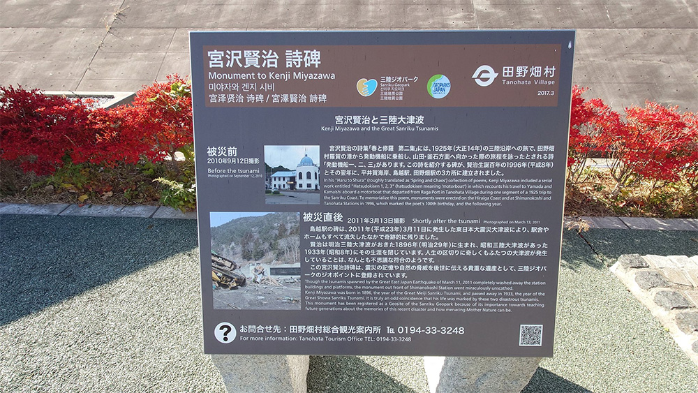 詩碑とともに、被災直後の様子が伝えられています。島越駅は東日本大震災により被災し、津波により、駅舎・ホーム・高架線路の全てが流失しました。