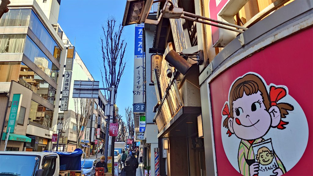 東西線で駅2つ分移動し、神楽坂で待って様子を見ることにしました。神楽坂のスタートの最寄りは飯田橋駅です。ペコちゃんの看板方向に向かうと神楽坂に入ります。