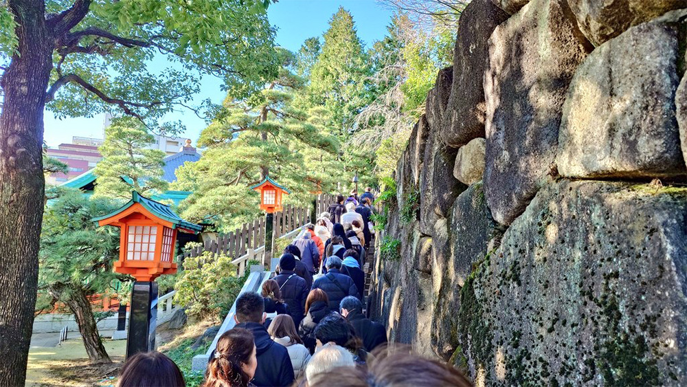石垣→ジグザグの行列→頒布行列を経て、一陽来復御守りを手に入れました。石垣から30分でした。