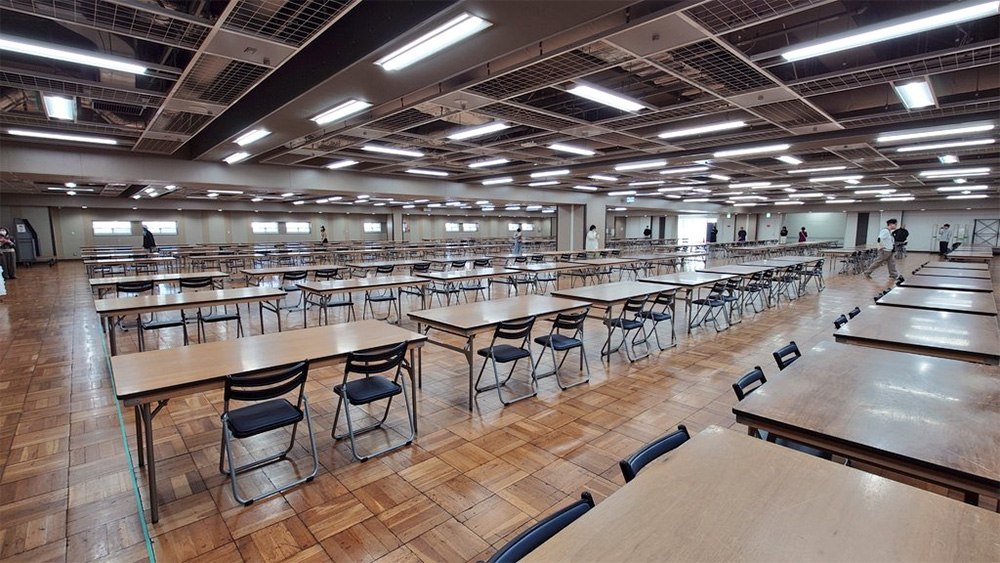 9:56am 会場に着いたら設営。みんなで机を並べました。今回のナギノの出店場所は1番向こう壁の非常口案内板の下のようです。