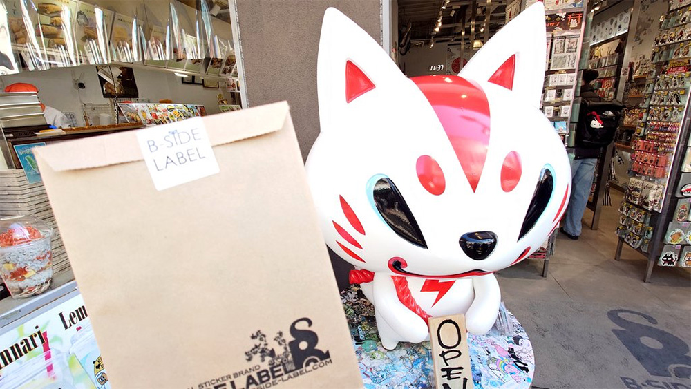 B-SIDE LABELは1万枚のステッカーを販売しているお店。可愛いキャラクターだけでなく、裏ストーリーもあったり、じっくり見てると面白いです。ハードな使用を想定して、光や水に対する耐性をつけている素材で作られているとのこと。
