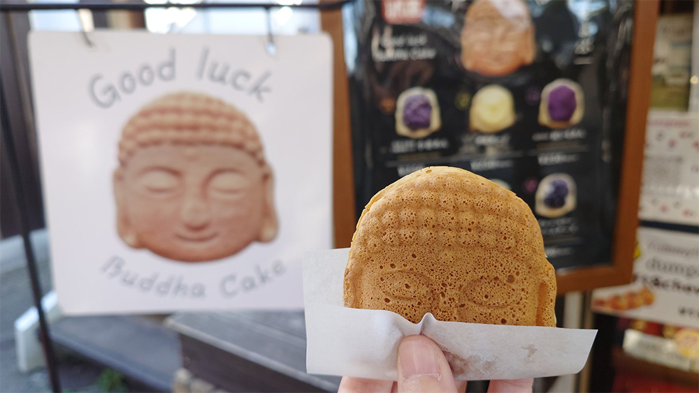 「幸せをよぶ 大仏さま焼き」です。鎌倉らしいビジュアルで可愛い♪中身の味は6種類。それぞれが健康運・人気運・金運・美人運・仕事運・恋愛運の開運につながると書かれています。「厚切りベーコンください!」…開運設定関係なく、味で選んでますね。
