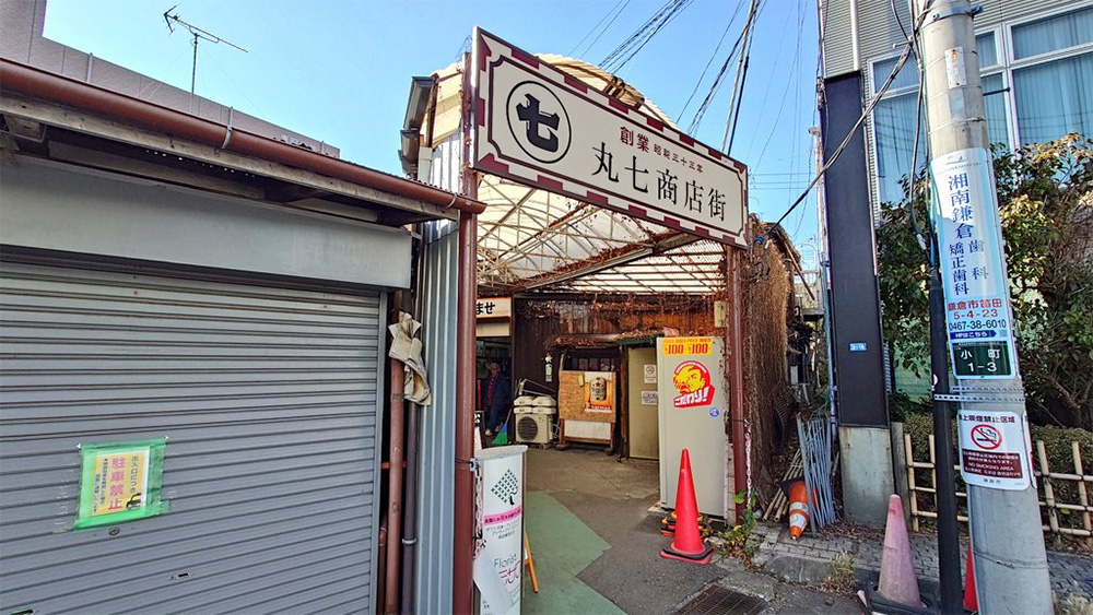若宮大路では特に買い物をせず、そぞろ歩きを楽しみ、たどり着いたのは丸七商店街。昭和33年から続く昭和レトロな商店街です。
