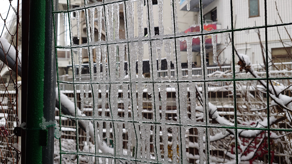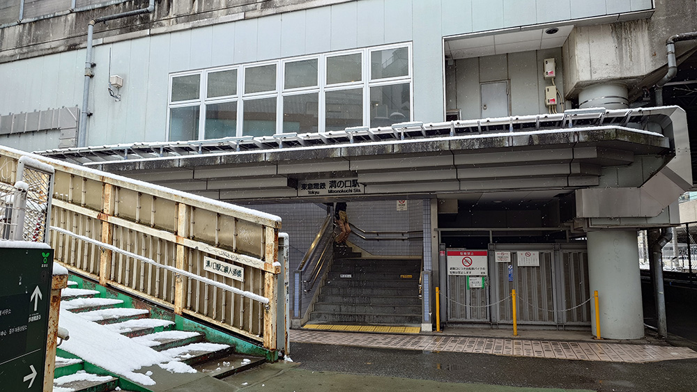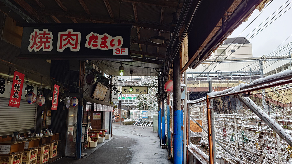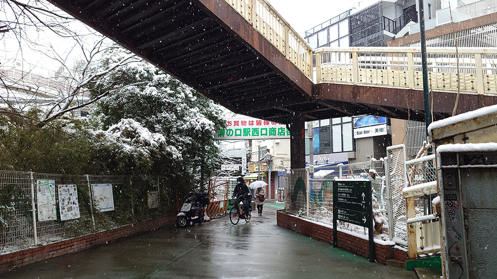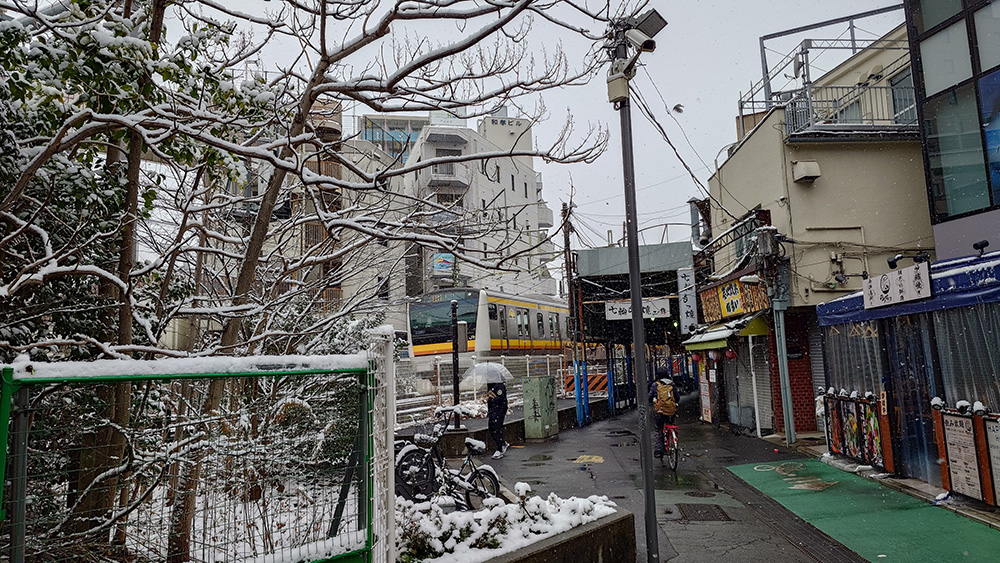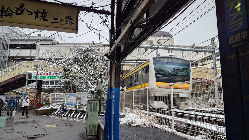 2026年2月8日、神奈川県川崎市は朝から雪景色!川崎で雪が降るのは数年に一度で、とても珍しいのです。溝の口(みぞのくち)駅前の古い商店街は、きっと雰囲気が出て素敵だろうなと思い来てみました。西口を出て目の前に広がるノスタルジックな景色、南武線が目の前を走っているのに、まるで遠い雪国に来てしまったような雰囲気です。