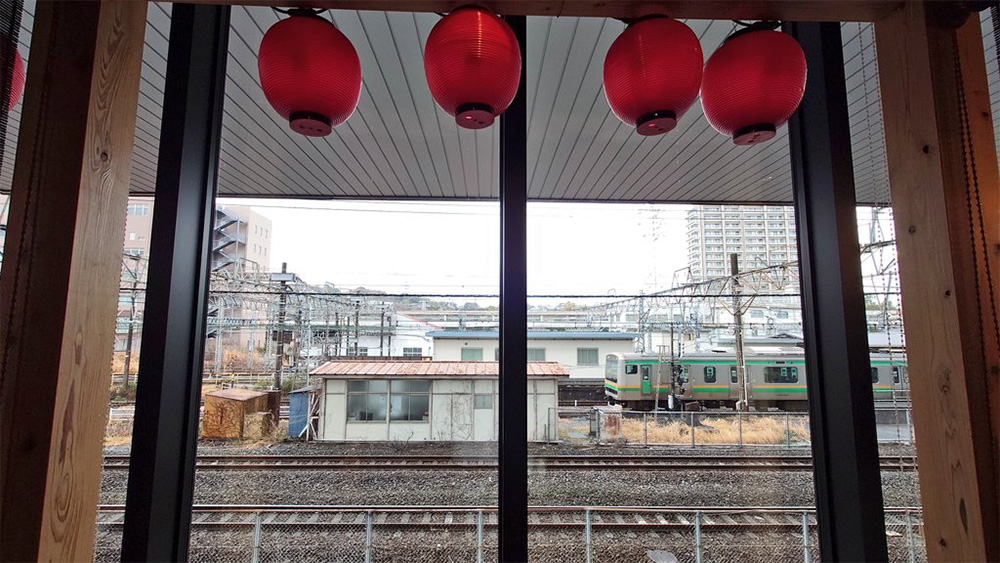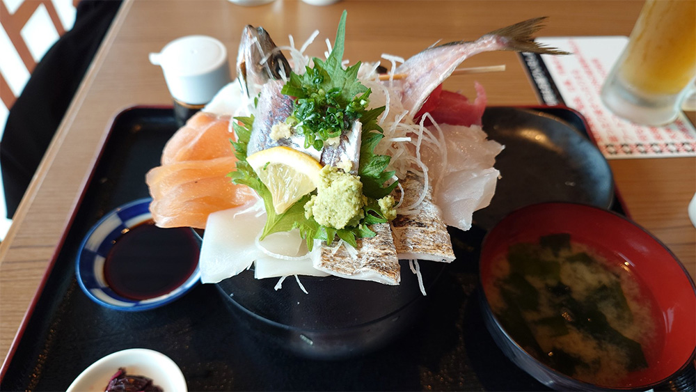 フードコートで「与一」のお魚丼を堪能します。席は個室風に囲まれたトレインビュー席♪