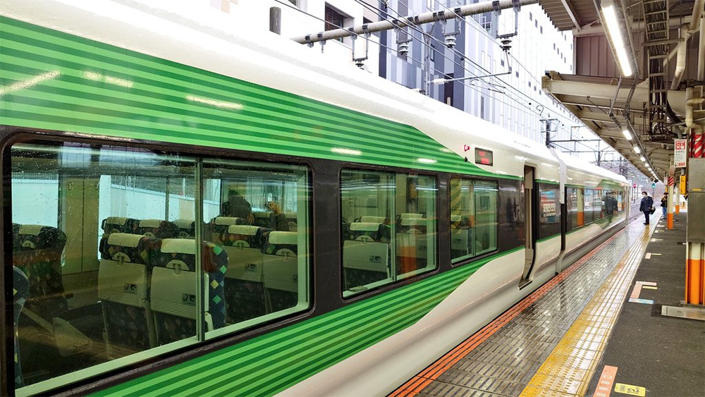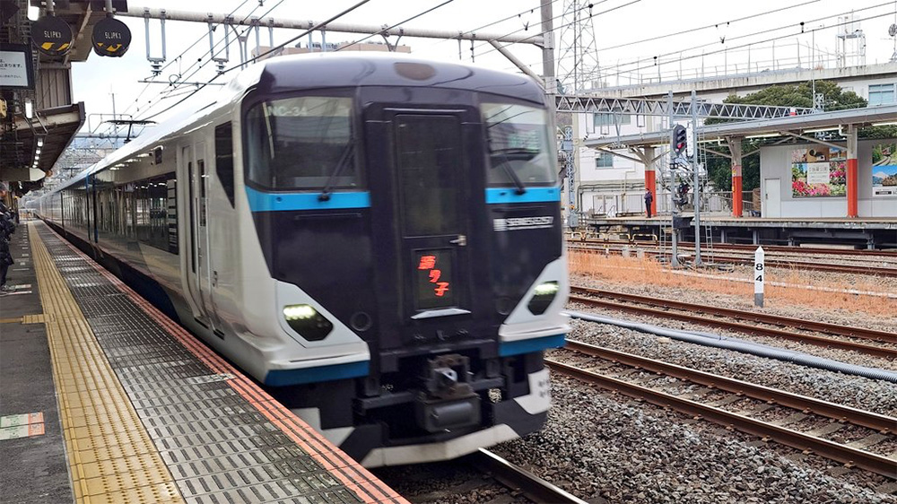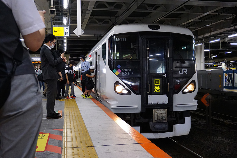 青の車両も緑の車両も、元々は中央線特急「あずさ」「かいじ」で使用されていた車両E257系でした。中央線から東海道線に移動してきたんですね。